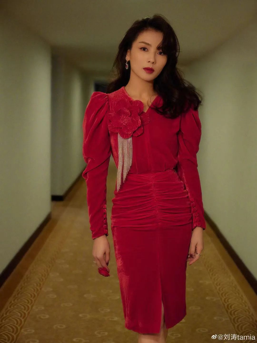 宋茜穿着 Chanel 2022 春季预告系列红色外套,山茶花也应景地变成了红色,经典的斜纹软呢带来优雅感。