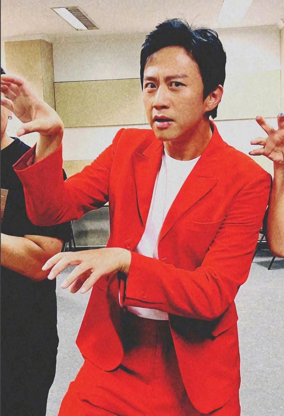 邓超穿着 StellaMcCartney 红色西装,边唱边跳过于活泼,差点跳出镜头画面。