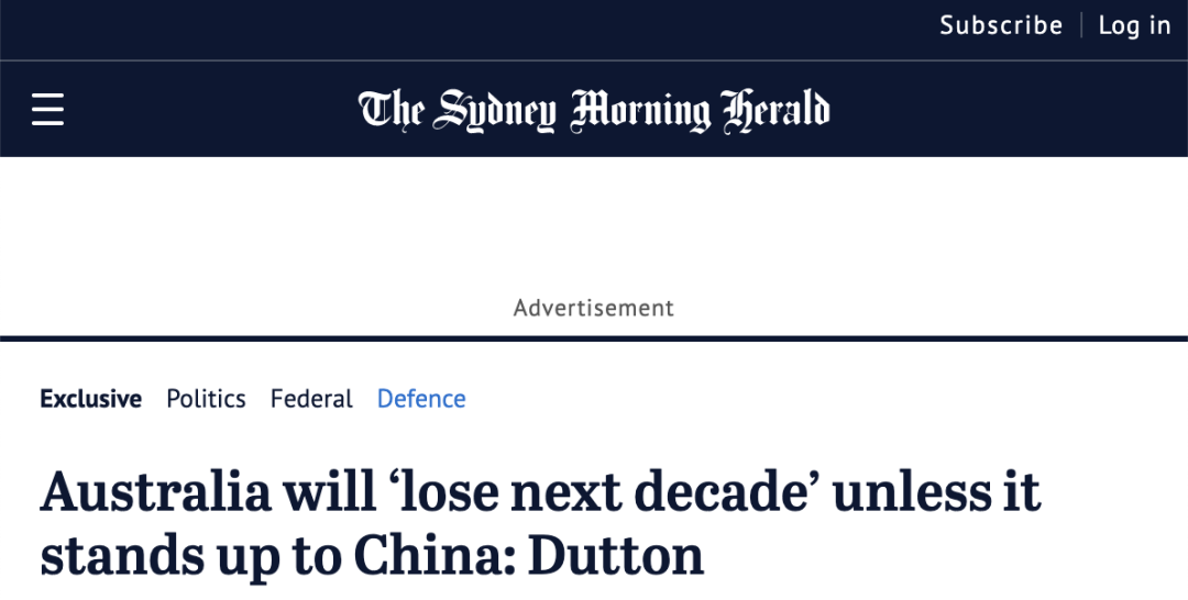 悉尼先驱晨报:达顿声称除非对抗中国,澳大利亚将“失去下一个十年”