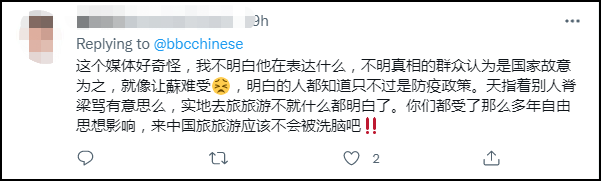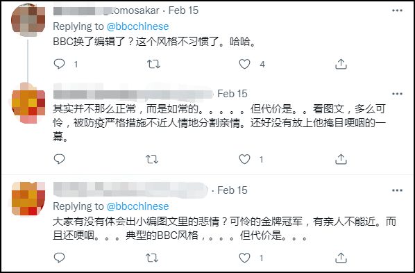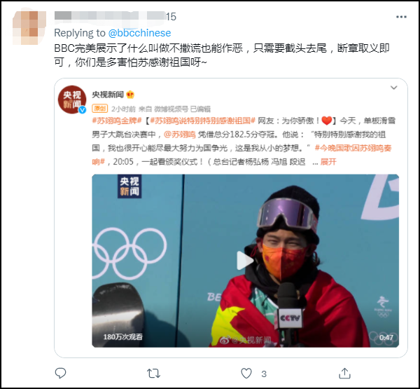 BBC又动小心思 网友:完美展示“不能撒谎也能作恶”原标题:BBC完美展示了什么叫“不能撒谎也能作恶” 2月15日,中国选手苏翊鸣在北京冬奥会单板滑雪男子大跳台决赛中夺得冠军。苏翊鸣完成惊人一跳时,BBC体育新闻在社交媒体发文盛赞:“艾萨克·牛顿的棺材板都压不住了!”(Isaac Newton would be turning in his grave at that!) 但在这个“荣耀时刻”,BBC新闻中文账号却将苏翊鸣赛后采访“感谢父母、感谢教练、感谢祖国”的话删掉,只截取了“不能和父母近距离接触”的片段做成图片报道。 有网民认为,BBC这番操作是为了突出“冬奥防疫措施严格不近人情,分割亲情”…… 随后,更多网民发现了BBC的“小心思”,有人讽刺道:BBC“完美展示了什么叫不能撒谎也能作恶”。 ![]() 截自BBCNews 中文 推特 15日的北京冬奥会单板滑雪男子大跳台决赛中,17岁的中国滑雪小将苏翊鸣以182.5分夺冠,拿到中国代表团本届冬奥会的第六枚金牌,自己也成为中国历史上最年轻的冬奥会冠军。本届冬奥会苏翊鸣收获一金一银。 赛后,苏翊鸣在接受媒体采访时激动地表示,“我知道我父母今天来看比赛,我不能和他们近距离接触,但我真的很激动。谢谢我的父母,我的教练,我的祖国!” “作为一个中国人,能够把我自己最大的一份力量贡献出来为国争光,”苏翊鸣深情地表示,“让所有人看到咱们中国滑雪现在站在全世界最高的位置,我觉得特别开心!” 到了BBC中文报道中,关键的“感谢父母、感谢教练、感谢祖国”却不见了。BBCNews中文官方推特在图片报道中,只强调了“我知道今天我父母来现场看了比赛,我也知道他们在哪,但我不能和他们近距离接触,我真的很激动……谢谢所有人对我的支持。” 起初,一些网友还感到惊讶。北京冬奥会开始后,一些西方媒体频繁抹黑中国严格防疫措施。而长期以来BBC更是走在抹黑中国的前列。因此在看到这则庆贺苏翊鸣夺冠的推特报道后,有网民称“BBC正经播新闻”、“画风突变”,有点不太习惯。 ![]() 然而,有一些网民发现,BBC在图片中,将苏翊鸣感谢祖国的话给截掉了,并质问BBC“怎么不敢引用”。 ![]() 又有网民分析称,BBC是要突出苏翊鸣“多么可怜,被防疫严格措施不近人情地分割亲情。”这名网友还贴出了BBC隐去的采访发言。 ![]() ![]() 一些网友斥责BBC“阴阳怪气”,让“不明真相的群众认为是国家故意为之,就想让苏难受。明白的人都知道只不过是防疫政策。” ![]() ![]() 一位网民贴出央视新闻的源采访并讽刺道,“BBC完美展示了什么叫做不撒谎也能作恶,只需要截头去尾,断章取义即可。” ![]() 其实将政治因素抛开,英国老牌公有媒体BBC还是十分“正常”的。苏翊鸣在比赛中完成惊人的一跳之后,BBC体育(BBC Sport)在推特上盛赞“艾萨克·牛顿的棺材板都压不住了!”(Isaac Newton would be turning in his grave at that!) ![]() |