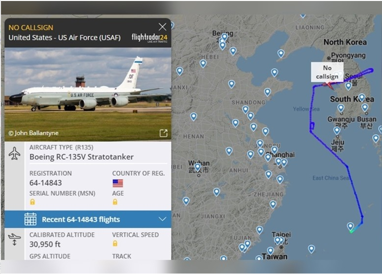 日防卫省发布11日解放军侦察船穿过对马海峡进入日本海的路线 而根据flightradar24网站发布的消息,美国空军一架RC-135V侦察机周四从日本冲绳县嘉手纳空军基地出发,先向北经东海飞入黄海,之后飞往东部进入韩国空域,在接近三八线的空域盘旋。