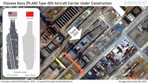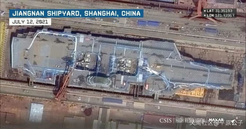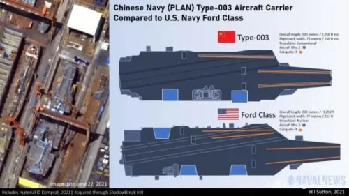 美国那边是直接和“福特”级对标的,商业卫星照片显示,中国003型航母长约320米,只比“福特”级短了几米,宽了几米,实际甲板面积差不多……这就是一艘八万吨级的“超级航母”,比辽宁舰和山东舰都大了一圈。
