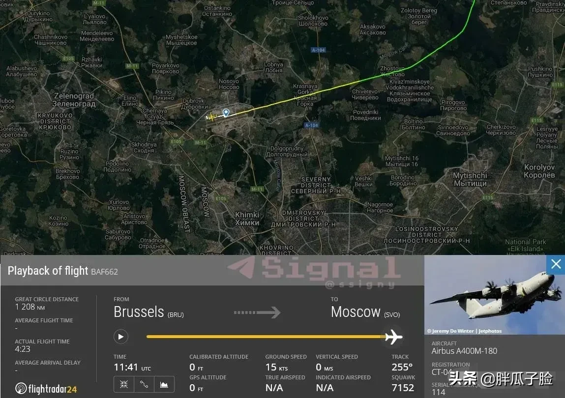 大鱼网住了!突发新闻:(5月2日),比利时空军空客A400M-180军用运输机从布鲁塞尔飞往莫斯科的谢列梅捷沃机场。 该军机搭载何人目前未知,访问的目的也未知。