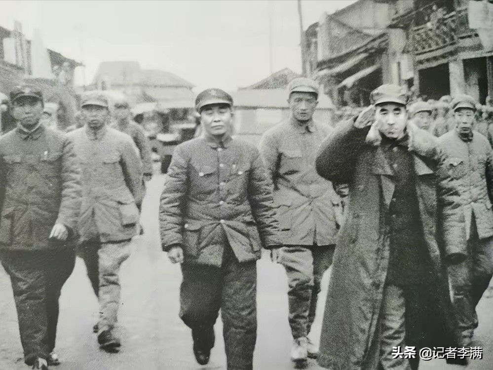 【老照片背后的故事】下图的照片是林彪边走边敬军礼的图片,此时的林彪虽然刚刚42岁,却已经是百万大军第四野战军的统帅。照片拍摄于1949年秋天,即四野大军进入湖南境内,追歼白崇禧集团之际。