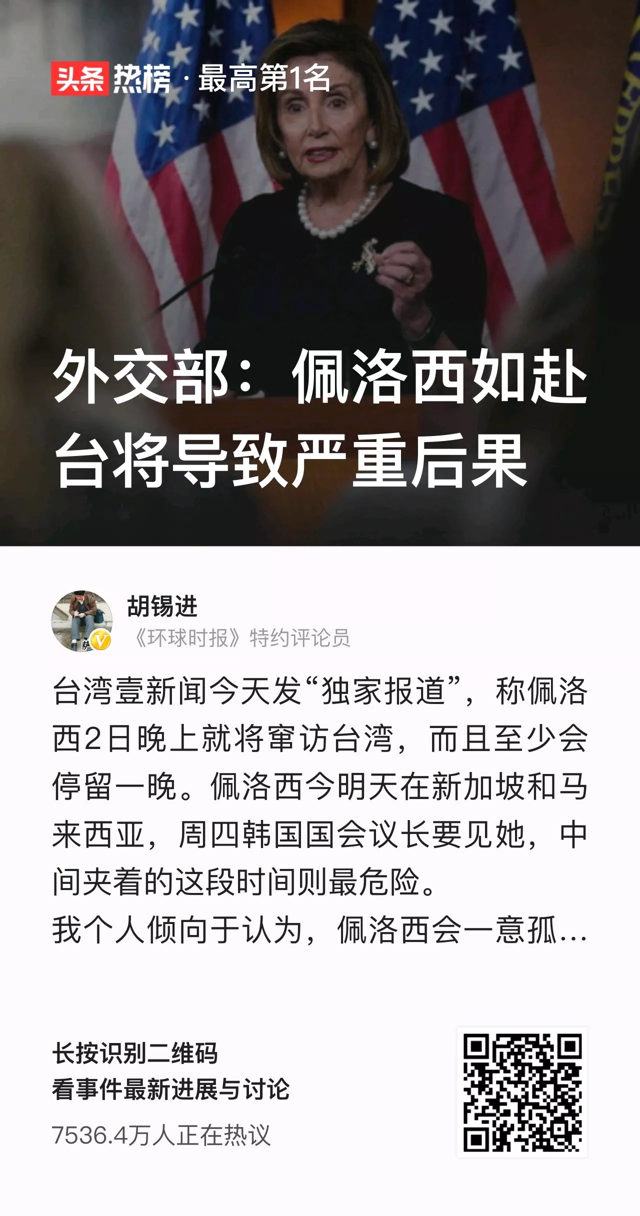#外交部:佩洛西如赴台将导致严重后果# 头条热榜