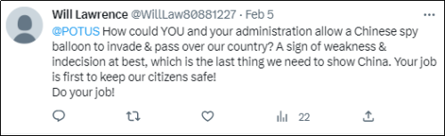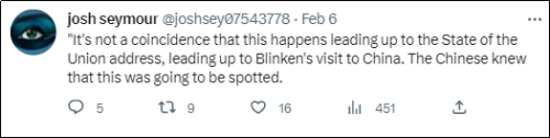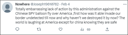 关注 来源:乌鸦校尉 大家好,我是乌鸦。 火了好几天的“流浪气球”事件,最终以美军第一主力战机F-22开火,以33.3%命中率击中“流浪气球”,使其坠海告一段落了。 美军F22大战中国“流浪气球”,听起来多多少少有点魔幻现实主义的味道,不过更加魔幻现实主义的是,谁也没想到,这只来自东方的小小“气球”,会把美国舆论搅得如此天翻地覆。 最近这几天,“流浪气球”在美国的舆论热度,堪称现象级。所有的美国媒体,无论大报还是小报,左翼还是右翼,头版头条几乎都被它屠版,各大社交媒体热搜也纷纷被它霸屏。 这件事的火热程度,可以用推特上广为流传的一张图完美诠释。 虽然目前事情的热度随着“气球”的击落逐渐消散,但回头来复盘“流浪气球”这一整件事情,会发现有不少值得玩味之处。 先说说事情的起源,也是此事在美国炸锅的开端,是美国当地时间2月2日,美国国防部向媒体透露,连续几日来北美防空司令部都在追踪一个已经进入美国本土上空的“Chinese spy balloon”。 值得注意的是,这个国防部官员虽然用了“间谍气球”的说法,但是同时他也补充说“这只气球在远高于商业空中交通的高度飞行,并且不会对任何人构成军事或物理威胁”,相当于对气球的无害性打了个补丁。 一是没有危害性,二是担心击落后碎片可能对地面人员构成安全威胁,因此美国军方最开始是建议总统拜登不要采取击落行动。 接着,美国海洋和大气管理局根据美国的侦查卫星半个多月来的监测数据,针对这个气球制作了一个路径模拟图。 显示出的“气球”漂浮路径是,先从中国西北地区升起,然后沿同纬度西风带一路向东,到达了韩国南部海域上空,接着又进入日本空域,再到美国阿拉斯加,又进入加拿大,之后又进入了美国“本部”的西北部。 这个路径形成的形状,只能说感谢大自然的鬼斧神工 也就是说,这只“气球”不光在韩日加美都溜达了一圈,而且,还进入美国领空两次,而这只“气球”一直到进入美国蒙大拿州上空的时候才被“目击者”发现。 而在美国发现这只“气球”之前,韩国、日本和加拿大一直都在保持沉默,到底是没能侦知还是低调处理不得而知,但从客观上确实为自己避免了尴尬。 因为根据国际法,如果一个国家的航空设备擅自进入另一国家的领空,那么,后者是可以将其直接击落的。 但是,根据现实实践中的国际惯例,如果进入领空的航空设备既非有意闯入,也不具备任何有害性,那么一般是会选择低调处理。 简单说就是,对“气球”的处理方式,很大程度上取决于主观上是想挑事儿还是息事宁人。 从事情的结果来看,韩日加都选择了“沉默是金”。 但美国人显然不一样,在美国媒体最先报道了“流浪气球入侵”一事后,此事在美国政坛和民间都掀起了一阵轩然大波,美国人集体破防。 当然了,站在美国人的角度上很好理解:以前都是我们随便闯入别人的领空领海领土,现在居然有别国放“气球”入侵了我们的领空,而且还是一个“间谍气球”,蓝星第一强国居然被别的国家的“气球”入侵甚至监视了!堪称奇耻大辱!!! 除了侮辱性极强对美国人的心理打击之外,让不少美国人更加敏感的是“气球”的活动位置。 在1月底2月初,它飞到了美国西北部蒙大拿州,是美国第341导弹联队所在地,其中暗藏着一百余枚“民兵III”洲际弹道导弹。 飘过美国蒙大拿军事基地之后,又飞向了美国本土最大的空军基地——密苏里州的怀特曼空军基地,美国人傲骄了30余年的B-2“幽灵”战略轰炸机就潜伏在这里。 从气球的活动位置来看,客观上确实是经过了不少美国非常敏感的地区。 一共穿越了21个美国军事基地 从上图来看,密布的军事基地,再加上美国的各大情报机构、生物实验室等等,可以说美国哪哪儿都敏感,浑身上下长满了敏感区,堪称敏感肌了。 当然了,对于美国内甚嚣尘上的“间谍气球监视美国”的说法,我国外交部在2月3日就及时出面澄清了:受不可抗拒气流的影响,中国飞艇(“气球”其实是美方说法)才误入美国领空,该飞艇属于民用性质,美国无需担心,不用于军事目的。 虽然我方已经做了澄清,但在海外社交媒体上,还是随处可见破防的美国人。 有美国人已经开始对本国的军事科技和政府的应对方式产生全面怀疑,并且极力拱火美国政府摧毁气球以“挽尊”。 “本届政府对飞入美国的中国气球完全没有采取行动,这真是令人尴尬啊。两件事儿,一是这个气球入侵美国领空为啥没被发现?二是为何我们至今都还没有摧毁它?全世界都在嘲笑美国,而中国知道他们这样做很安全。” “发送间谍气球显然是有意挑衅,目的是向美国人民表明,在本届政府的领导下,中国可以不受惩罚地侵犯我们的领空。拜登总统必须立即采取行动,捍卫我们的主权和国家安全!” “@美国总统,你和你的政府怎么能允许中国气球飞越我们的国土?这是软弱和优柔寡断的表现,这是我们最不需要向中国展示的东西。你的工作首先是确保我们公民的安全!做你该做的!” “如果中国可以让间谍气球入侵美国领空而美国政府却毫无反应,那么中国接下来会派什么去入侵美国的主权领空?我们正在接受一个最傲慢的中国的考验,但失败了。” 在击落“气球”前美国民间的主流声音,基本就是骂拜登不敢打中国的气球,骂他对中国软骨头,起哄对中国反击。 而比美国老百姓更上头的,是作为政府反对党的共