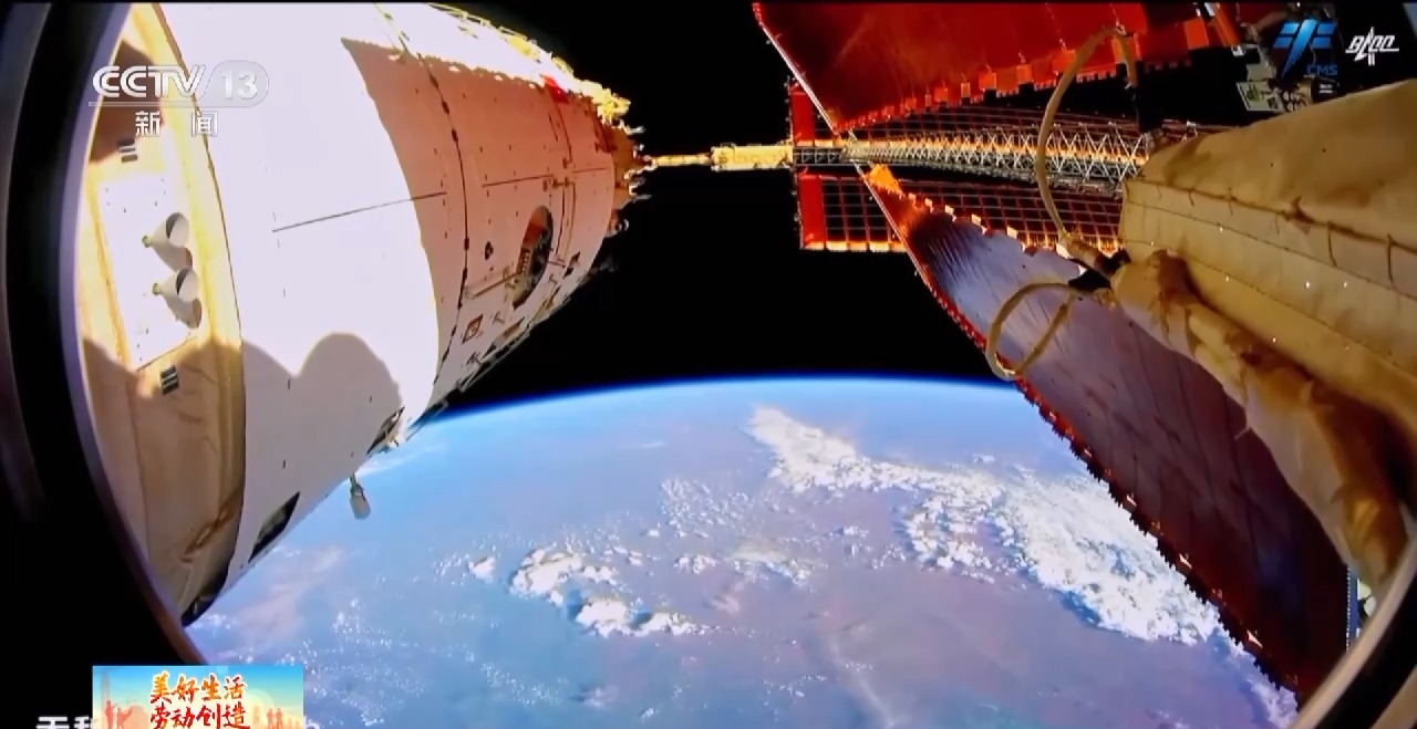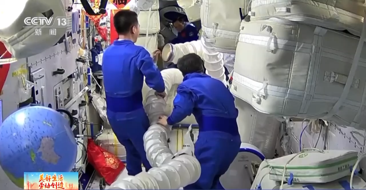 总台央视记者 陶嘉树:航天员所需的食物、水、实验设备等物资都是装在货运飞船的货物舱里,快递到空间站的,航天员通过货运飞船与空间站的对接口进入货运飞船。