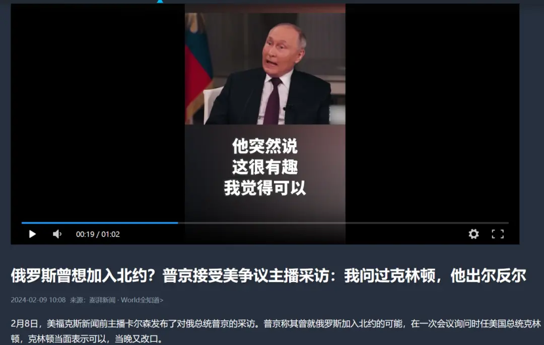 采访一开始,普京花了半个小时的时间,讲述了东欧平原一千多年来的历史,包括俄罗斯民族的形成,俄罗斯与乌克兰与波兰之间的关系,苏联时代的一些事情等等。在这段讨论里,基本上是普京说,卡尔森一脸迷茫地听。考虑到卡尔森并不以历史知识的广博见长,而这些内容也超过了大多数欧美观众的知识范围,这产生了相当戏剧性的效果,以至于在欧美评论区能看到大量把拜登的精神状态和普京讲半个小时历史进行对比。