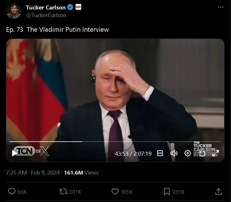 这次采访本身也很有趣,中文舆论场关于这个采访的站队也相当值得观察。 普京说了什么 首先介绍一下塔克卡尔森,他是美国保守派新闻主持人,在美国属于顶流中的顶流,在整个欧美保守派群体中有不可替代的影响力。之前是福克斯新闻的王牌主持人,但是因为政治压力被福克斯开除,后来出来单干,他采访过很多保守派意见领袖,也采访过特朗普,米莱等政治人物。
