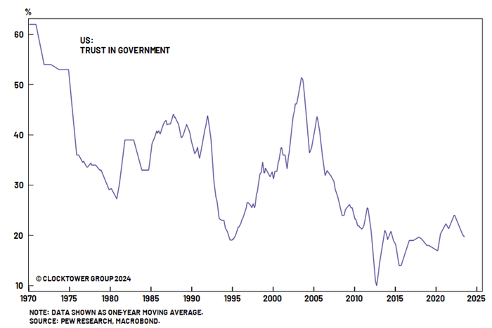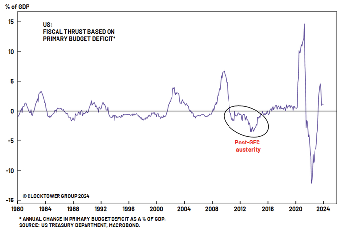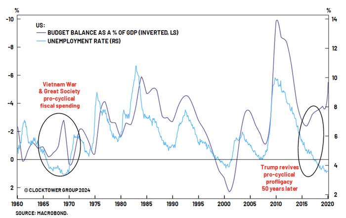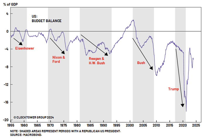 我们对将与中国的第一阶段贸易协定纳入政策优先事项清单感到好奇。我们认为,这一纳入是乐观的,因为它为未来的谈判阶段开辟了可能性。值得注意的是,继续与中国的贸易谈判其实是特朗普总统在2020年初的初衷,但由于疫情的爆发,它不得不将疫情归咎于北京,并转而与对华鹰派结盟。 其次,通过将USMCA协议定义为“平衡、现代化和以工人为导向”的贸易协议,AFPI表明,在特定基础上开展双边贸易还有很大空间。这一点很重要,因为特朗普对10%关税的即兴发言表明,他可能会在任期初期推行当年的尼克松战略,甚至对与他自己政府签订了贸易协定的伙伴,例如墨西哥和加拿大等,征收全面进口关税。因此,如果AFPI肯定了既有的双边贸易协定,特朗普第二任期或许也很难对所有国家统一征收10%的关税。此外,AFPI文件还表明,特朗普可能仍然会采取强硬的谈判措施,但他会带着达成交易的意图来进行谈判。 完成边境墙。不出所料,AFPI认为美国需要完成与墨西哥的边境墙。网站上有很多关注这个问题的政策文件。该研究所的大部分政策重点仍集中在防止贩毒集团向美国运送毒品。然而,没有任何材料表明即将上任的特朗普政府将越过边境进入墨西哥对毒枭发动军事行动。 我们对AFPI文件分析得出的结论是,重塑美国官僚体系确实是特朗普总统选举纲领中最为深思熟虑的部分。他的贸易政策基本上与其第一任期相同。但令人惊讶的是,USMCA和中国第一阶段协议仍然受到其MAGA盟友的肯定。这很重要,因为它表明特朗普第二任期下的美国贸易保护主义可能并不会急剧上升。事实上,特朗普政府很有可能与亚太地区国家签署以USMCA为蓝本的贸易协议。此外,由于特朗普或许能在与北京的后续贸易谈判中获得让步,中美关系可能因此而实现更为长久的缓和。 我们长期以来一直认为,由于在美国国内的回旋余地有限,拜登政府无法向北京做出任何让步。与拜登不同,特朗普总统在中国问题上拥有绝对的政治资本,因为美国国内没有任何人可以指责特朗普总统对中国软弱。正如“二十世纪只有尼克松可以去中国”一样,“二十一世纪或许只有特朗普可以与中国谈判贸易协议”。 令人意外的是,AFPI网站上有关外交政策的内容很少,其甚至没有提到乌克兰。我们一直以来的观点是,无论特朗普是否干预,俄乌冲突都会自然而然地发展到一个平衡状态。在俄乌冲突的终局上,投资者应该参照朝鲜半岛战争。 四、市场影响 特朗普第二任期对市场意味着什么呢? 财政政策 值得注意的是,AFPI的政策菜单中并没有任何企图控制美国财政赤字的政策诉求。 提醒一下大家,特朗普第一任期唯一的一个立法成是2017年的《减税和就业法案》。虽然该法案最终取得了很多成果,但它并不是税收中立的。在我们看来,该法案打破了美国50多年来认为顺周期财政政策是愚蠢的这一政策共识。随后,为应对新冠肺炎疫情,特朗普总统进一步加大了非常规财政力度,将财政刺激推升至半个多世纪以来从未有过的水平。 图片来源: Clocktower Group在整个疫情期间,特朗普总统实际上卷入了一场与众议院议长南希·佩洛西(Nancy Pelosi)的争斗中,他们争相比拼看谁能在财政政策上更加挥霍以迎合美国中间选民的诉求。迄今为止,美国是全球疫情期间财政刺激规模最大的国家,并且是唯一主要通过向家庭直接转移支付来刺激复苏的主要经济体。 正是由于特朗普总统挣脱了华盛顿共识的束缚,这在客观上使得拜登总统得以在其任期初继续挥霍财政。特朗普第二任期会否一反常态,从而扭转过去多年的财政挥霍呢?我们对此表示怀疑。拜登总统任期内的财政支出——特别是2022年《芯片和科学法案》以及《通货膨胀削减法案》——得到了两党的支持。例如,从通货膨胀削减法案中获益最多的反而是许多“红色州”,例如德克萨斯州和佛罗里达州。因此,特朗普政府不太可能在参议院获得足够的共和党选票来推翻这两项法案。 相反,我们认为特朗普总统会提出一个非常公平的问题:如果拜登总统可以在基础设施、科学发展,和绿色转型上大幅提高政府开支,为什么我不能在边境墙、减税,和棕色科技上花钱呢? 此外,美国历史清楚地表明,共和党一直以来所提倡的财政审慎主义完全是虚伪的。自艾森豪威尔总统(Eisenhower)以来的每一位共和党总统在其任期内都扩大了联邦政府的预算赤字。特朗普总统在他的第一个任期内也没有什么不同,美国的预算平衡早在疫情发生前就已显著恶化。 图片来源: Clocktower Group唯一可以扭转美国财政挥霍倾向的力量可能是债券市场的崩盘。我们完全可以预料到在特朗普总统第二任期内的某个时间点会出现这种情况。然而,我们也认为特朗普总统在发生债券市场崩盘时能够创造性地找到解决方案。例如,特朗普总统大概率会胁迫美联储启动收益率曲线控制(YCC)政策,以实现他的财政优先事项。因此,如果特朗普在今年赢得大选,我们将进一步强化我们结构性看空美债的观点。 投资者应该记住MAGA意识形态的根本支柱是什么。一是美国选民对政府的信任度下降。另一个是美国政策制定者无法通过立法来解决根深蒂固的收入不平等和社会流动性不足的问题。因此,美国政策似乎总在保守和非常规手段之间摇摆不定,有点像许多拉丁美洲的经济体。 特朗普的第二任期——就像今天的拜登和第一任期的