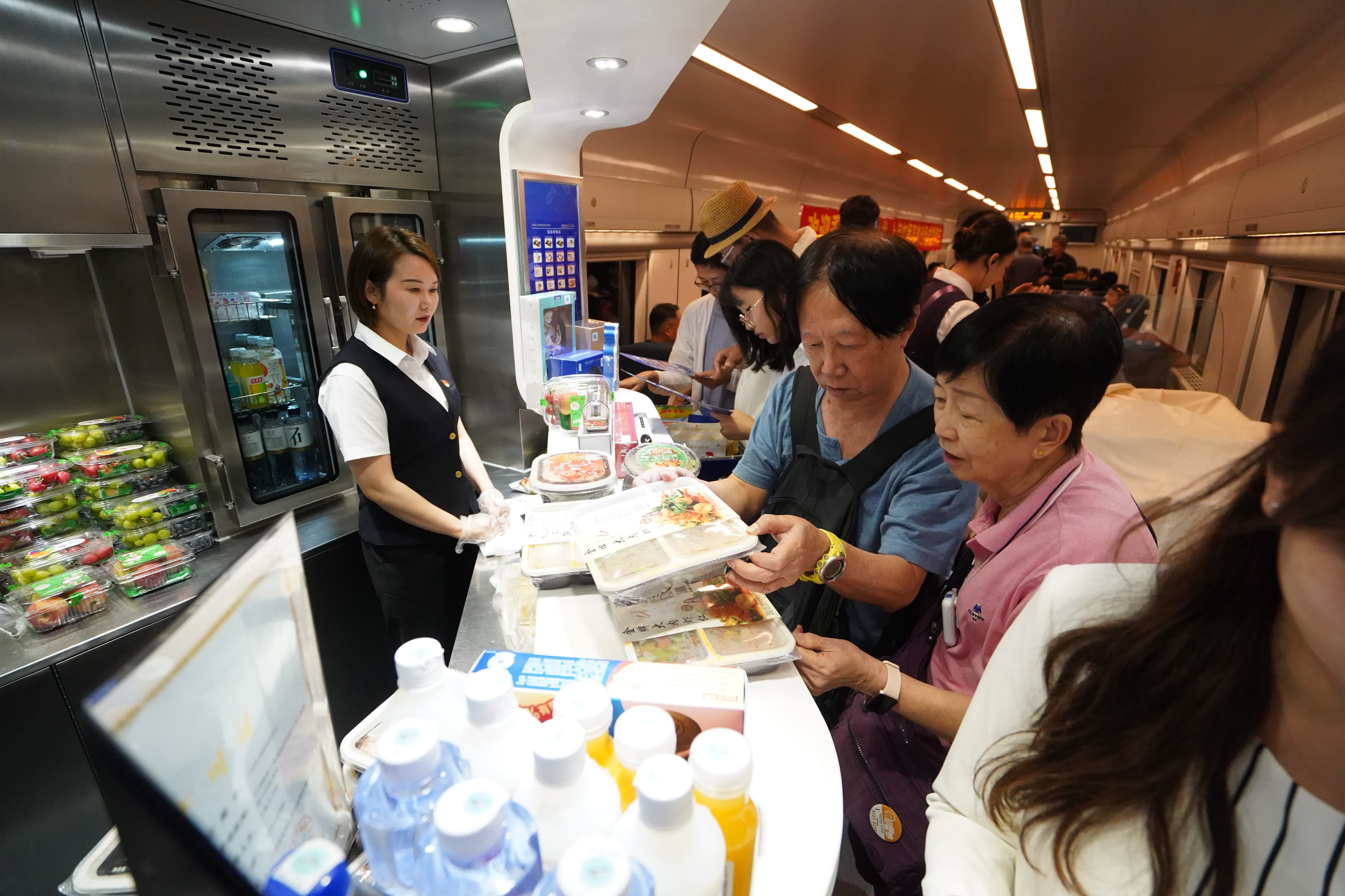 記者還了解到,為方便夜間和早晨的用餐需求,動車餐飲部根據線路特色,特地準備了港式風味荔枝肉套餐、三鮮魚丸套餐、蝦肉餛飩麵、蜜汁叉燒腸粉等具有港式風味的餐食,打造舌尖上的美食之旅。同時,在動臥車廂內設置了獨立的餐牌,方便旅客了解和選擇餐食品種,並通過暢行碼快速點餐。