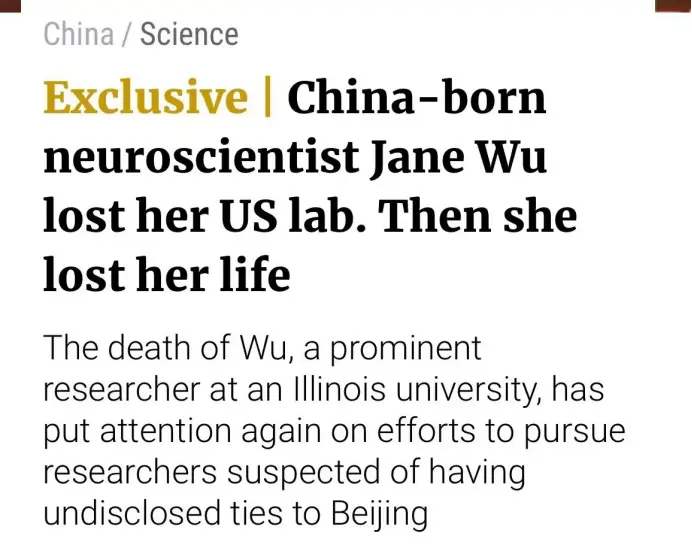 吴瑛教授自杀身亡,令家人、朋友和同事震惊不已,在中美引发了广泛关注。关于其自尽的原因众说纷纭。直到一个多月后,其真相才被媒体曝光:吴瑛教授是已中止的“中国行动”计划的“牺牲品”。曾是美国国立卫生院针对华裔科学家的政府行动调查目标 8月31日,《南华早报》的消息称,美国国立卫生研究院校外研究办公室在《华盛顿邮报》等媒体多次咨询吴教授的相关情况时,这家“中国行动”计划的执行机构,拒绝透露吴是否调查目标。但据知情人士表示,吴瑛也是美国国立卫生研究院的调查目标,并被赶出了实验室,尽管她从未被起诉。 杜克大学(Duke University)的癌症研究教授王晓凡(音)披露,“这些调查毁掉了她的职业生涯。她是一位如此敬业的科学家。剥夺她做研究的权利就像剥夺了她生命中最重要的东西,” 吴瑛教授长期接受美国NIH的科研基金资助。她最后一个NIH资助的项目总计300多万美元。开始于2018年9月18日,终结于2023年6月30日。 吴瑛教授自杀前,美国国立卫生院已对吴进行了相当长时间的调查,并不准她继续申请科研基金。 她的研究基金在今年4月30日到期后,西北大学宣布关闭了她的实验室。被要求不再申请美国国立卫生院的研究基金,相当于将她的科研权强行剥夺。 “性格坚强的吴瑛教授在规定时间内还不愿意离开实验室,警察便将她强行从实验室带走。” 而更诡异的是,吴工作了二十多年的西北大学范伯格医学院,不仅没有发布任何讣闻与说明,还在吴去世不到一周的时间,将她的个人资料页面全部删除,其他网页,如她在西北大学学者网站上的出版物和资助记录,也已被删除,这种反应极其不寻常。媒体推测,吴供职的西北大学与美国NIH可能联合实施了对吴的调查。 自7月以来,西北大学一直拒绝回应媒体的多次询问。 这一事件在《华盛顿邮报》等媒体报道后,引发了美国科学界的哗然。