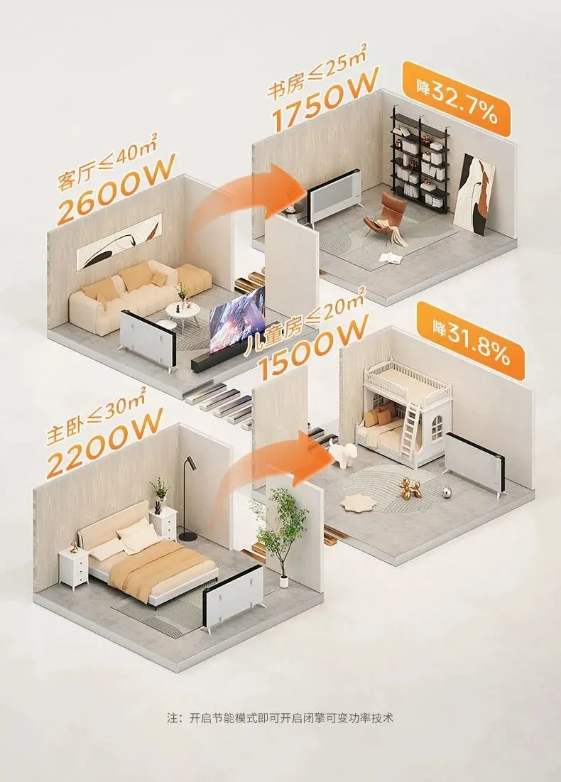 △百斯腾取暖器再工作过程中,根据环境温度不断变换加热功率的测试 再加上 闭擎可变功率技术 。 可以在开启节能模式后,在转换不同大小房间时,2600W的机器,瞬间关闭一套引擎,功率降低到1750W。 这样就可以在使用时,小房间和非严寒天气用小功率,大房间和严寒天气用大功率, 相当于同时购买了一大一小两台机器,不仅实用,当然也就更省电了。