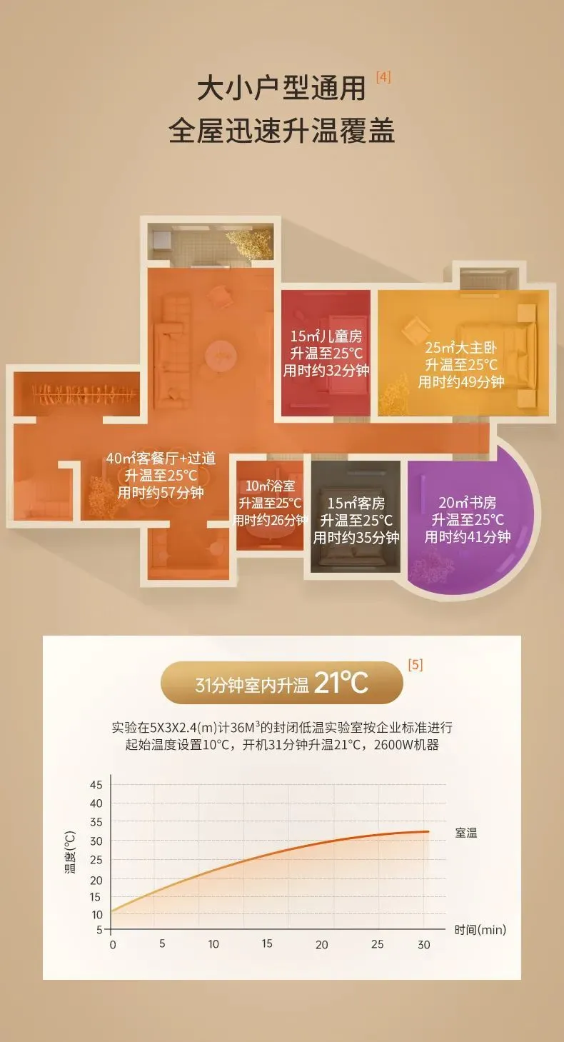 这回大家理解什么叫双核制热,双效散热了吧。 到底多快多暖?再给大家看一组品牌方专门做的升温实验,在一个36m³的低温实验室房间中按企业标准测试了一下,最后得出:31分钟可以升温21°C。 同时,他们还搭建了一个升温模型了,针对不同面积房间升到 25℃(人体舒适温度)所需时间(根据地区气候不同、墙体厚度、窗户密封程度会有差异)。