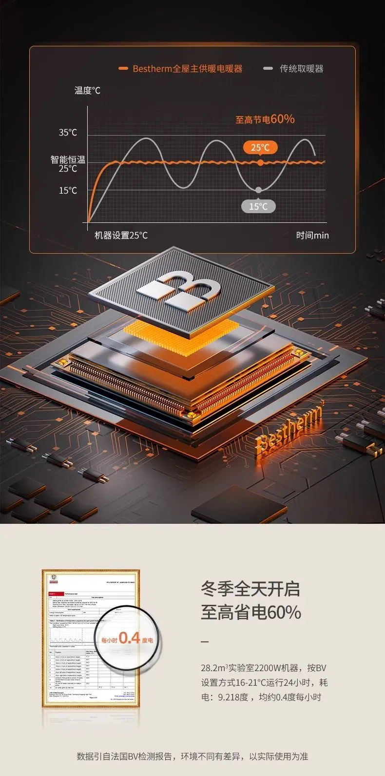 很多小伙伴看到这样的升温速度,可能想问会不会很耗电? 其实并不会, 百斯腾H1可以做到精准恒温控电,节能效率高达60%! 按BV设置方式测试:在28.2立方米实验室2200W机器按设置16℃到21℃运行24小时),机器平均每小时0.4度电,比起没有节能技术的同类机器至高省电60%。