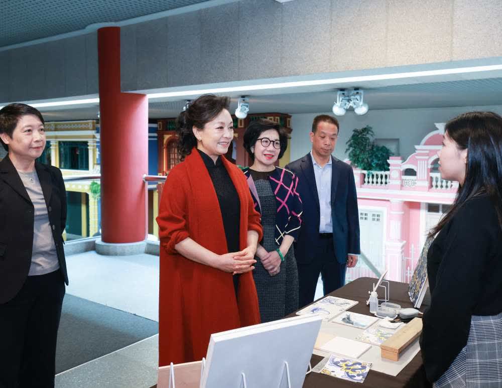 據新華社報道,12月19日上午,國家主席習近平夫人彭麗媛在澳門特別行政區行政長官賀一辗蛉肃嵥刎懪阃拢瑏淼桨拈T博物館參觀。彭麗媛仔細察看館藏文物,深入了解澳門的歷史變遷和中西交融的建築、行業、文化生活等情況,同當地瓷磚畫製作、木雕等非遺傳承人親切交流。