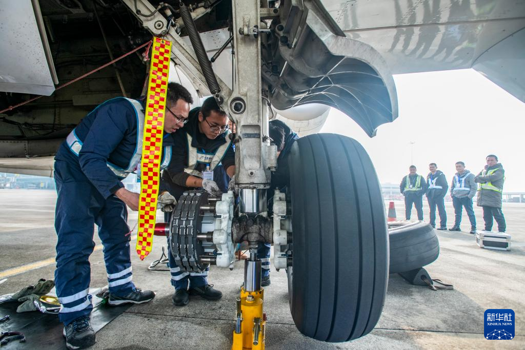 2024年12月31日,重庆万州五桥机场,技术人员为执行本次验证飞行测试的国产C909飞机安装国产制动系统零部件。 2025年1月1日凌晨,华夏航空的国产C909飞机平稳着陆重庆市万州区万州五桥机场,标志着该型号飞机国产制动系统的验证飞行测试顺利完成。此次飞行测试的成功为进一步提升国产飞机的技术水平和市场竞争力奠定基础。 新华社发(冉孟军 摄)