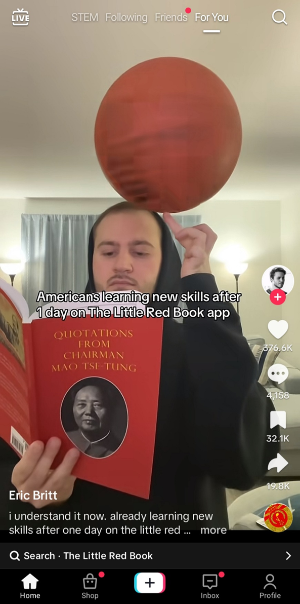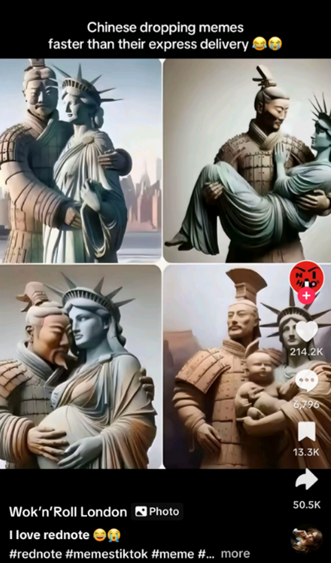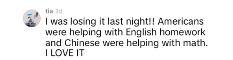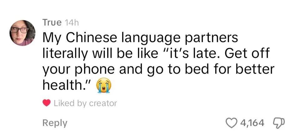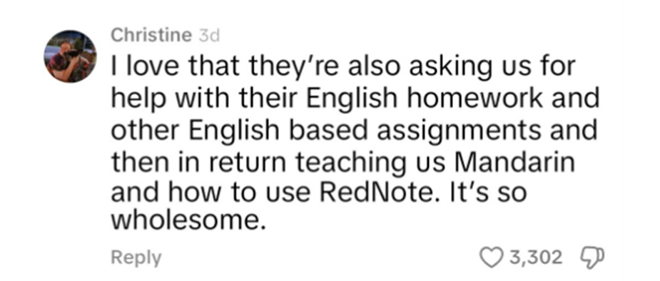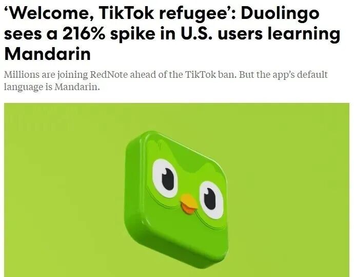 这几天铺天盖地的从tk搬迁到小红书的老外们,速成学到中华文化精髓后,扭头回去就已经在他们的社媒里卷起来了!Tiktok、X、油管上,“小红书RedNote”都是热词啊~ (前情回顾请戳:2025开年,小红书打响洋悟运动第一枪) 如果说这是中国普通网友首次开眼看世界,对世界普通民众来说,又何尝不是首次开眼看中国呢? 这一波内卷文化,已经直接干到外卷。不得不说,这扎实高效落地的民间文化输出,干得实在太漂亮了! 这几天我白天刷小红书,晚上刷tk,忙着对齐双边颗粒度,比追剧还要刺激,笑死在两边的评论和帖子里出不来。 毕竟在小红书上,老外们多少还有做客的扭捏嫌疑,回到tk后,就像是回家后关起门来,自己叽叽喳喳的在对答案。 但不能只有我一个人笑死,必须也让宝子们看看,这些小老外们偷偷从小红书上学到了什么,又翻回去在tk上卷起来的?(本文截图来源均为Tiktok洋抖) 1️⃣ 卷中华文化 来都来了,不整本小红书回去看看,好意思么? 我在小红书上学习了一天后 2️⃣ 卷作业 第一波帮人家写英语作业,还写错了的美国人,已经回去反省补课了。 也有因此深深爱上写作业的一波! 美国人帮他们写英语作业,中国人帮我们写数学作业,爱死! 我太喜欢我教他们英文,他教我们中文了。太棒了! 不聊了,我得辅导一个明天有英语考试的孩子。 3️⃣ 卷中文 如果说禁tk是给小红书带来了泼天流量,那么小红书就给知名烦人绿鸟多邻国duolingo带来泼天流量。这一波操作下来,多邻国app躺赢,因为美国人都在学讲中国话。 多邻国是一个知名的学习语言app,近期官方发布数据表示,与去年同期相比,美国学中文的用户激增了216%。 嗷~ 所以,你现在开始学中文了 时至今日,小红书仍然高居美国苹果商店下载榜榜首,而Duolingo则一举冲上了教育类APP的第二名。 办了20多年的孔子学院,不如在小红书里泡2天刺激,中文学习已经在小老外里迅速卷起来了。 我被四个20多岁的女孩喊宝贝儿,因为我说我不会说中文。结果她们说“没关系,宝贝儿,我们教你!” 我爱人类! 4️⃣ 卷养生 美国人回tk后,已经开始告状:“小红书霸凌我,要我必须吃健康一点!” 谁也抵抗不住我大中华的健康养生输出啊~ 他们担心我喝的茶太多糖了 我跟他们说我喝全糖功能饮料,(有个小红书网友)说她有一个护士盆友,提醒我那个饮料对我的心脏有伤害。 我中文搭子告诉我说:太晚了,关机睡觉,身体好! tk网友已经听劝,开始做起了中华养生鸡蛋羹。 当然,必须要多喝热水! 这的确是我们需要的严厉的爱! 5️⃣ 卷造梗 我们中方这边造梗长这样: 他们美方那边造梗长这样: 我和我的中国spy胜利会师! 这正是我一直在找的“从敌人到恋人”。 6️⃣ 世界开眼看中国 卷完后,最难能可贵的是,小老外们回去后,都纷纷充当了中国自来水,在tk上激动表示,他们在小红书收获了多少颠覆他们对中国的刻板认知。 外国博主们用到最多的词是“Culture Shock 文化冲击”,开眼看对方这事,对双方都是震撼! 我真的,这一波民间小老外的现身说法,把对中国的刻板印象一一纠正。中国在全世界人民前面的形象,从来没有这么生动活泼过!这是我们国家外交部多少年做梦都要笑醒的结果啊! 我太开心了,他们原来跟我们一样不正经! 他们真地狱级的太好玩了! 没法相信他们有多少个搞笑段子!他们很甜蜜又幽默,这是我有生以来所有用过的社媒app以来,体验感最好的一个! 他们好嘴甜啊,有人跟我说“晚安,小甜心” 我正在小红书上,这里真的太惊喜了