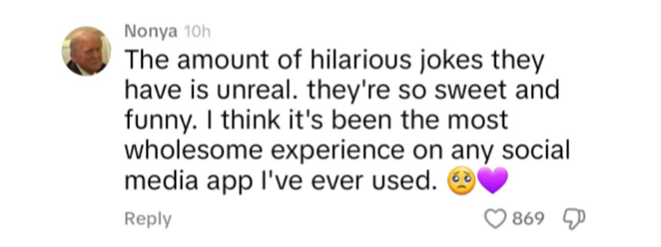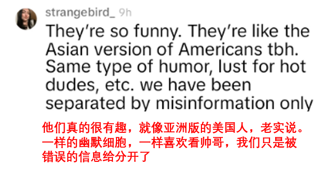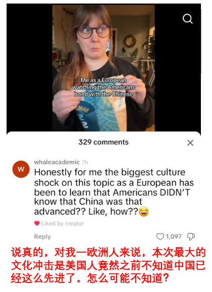 我自己最喜欢的评论是这条欧洲人发的,无情嘲讽了美国人的信息茧房一把。 有个点赞十多万的tk视频,标题就是《现在我们知道中国比我们好了》... 已经有纽约小老外表示,我要搬来中国!明天就来! 让我最受感动的是这一条评论,看得我都要落泪。 是啊,美国tk网友的抗议反叛,无意中触发一个打开地球村的按钮。中国民众开眼看世界的同时,世界人民也开眼看中国。 这一波自发的民间交流,没有任何利益驱动引导或控制,就是单纯的好奇友善初心。双边都真诚沟通交流,打破刻板的同时,发现我们其实都一样。那接下来,就请让我们一起长大吧。 地球村,原本不就本该如此么? 前情回顾请戳: *** THE H END *** 能看到这里的都是真爱了,关注我哦~ 我会持续分享在英国的有趣经历和感受,也欢迎在留言区告诉我你的故事。
