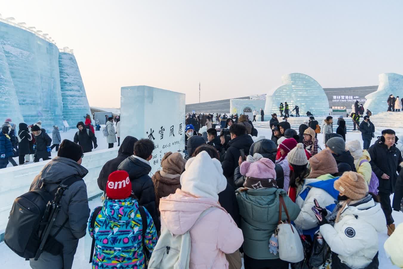 「哈爾濱太寵客了,兵馬俑的冰雕栩栩如生,真的是太奇妙了!」來自西安的遊客李女士沒想到在哈爾濱能看到精緻的「冰」馬俑,興奮地不停拍照。去年冬天備受好評的「冰」馬俑升級返場,將軍俑、跪射俑、軍吏俑、武士俑、立射俑各個威風凜凜、栩栩如生;建造許願冰牆,書法老師以冰為信箋替網友書寫心愿,向滿園冰雪許下美好期待與深切祝福,為即將到來的乙巳蛇年增添小確幸和小浪漫;以及冰封玫瑰牆、飄雪機、十二生肖景觀、春節主題冰雕群等等,大家想要看到的,哈爾濱冰雪大世界都努力實現。