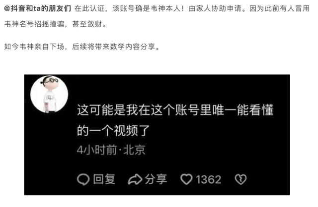 北大“韦神”粉丝已超1000万!家属回应牙齿问题近日,现正在北京大学任教的韦东奕、网友熟悉的“韦神”发布视频和网友打招呼,其个人简介标注为“韦东奕本人账号”。 截至6月7日凌晨,韦东奕账号粉丝已突破1000万。 ![]() 目前,该账号仅有1条4秒的出镜视频,是韦东奕的自我介绍,只有短短3句话,“大家好,我叫韦东奕,这是我的账号。” 6月6日晚,平台相关官方账号证实,该账号系韦东奕本人。 ![]() 此外,有网友发现“韦神”和网友们打招呼的视频中,画面显示其部分牙齿掉落。 ![]() 针对网友关心的牙齿问题,其家属称,韦东奕牙齿的问题有很多原因,患牙周炎曾治疗多次,还要去医院检查。 九派新闻报道,其堂哥表示,韦东奕开设账号的主要目的是为防止恶意剪辑与造谣行为的蔓延。近年来,网络平台上充斥着大量偷拍、断章取义的韦东奕视频,一些甚至被恶意包装、营销,严重侵犯了韦东奕的肖像权与个人形象。 “他本人像一张白纸,很多时候根本不知道外界发生了什么。”开设个人账号是为了“建立一个真实可控的窗口”,是家人提议、本人同意的决定,并非为了流量或商业行为。 堂哥说,虽然账号已经开通,韦东奕并不打算开直播,除非本人有主动意愿。“他很担心被恶意截图、拼接成片段,会有不好的舆论影响。” 来源:中国青年报综合九派新闻、当事人社交平台、此前报道等 |
