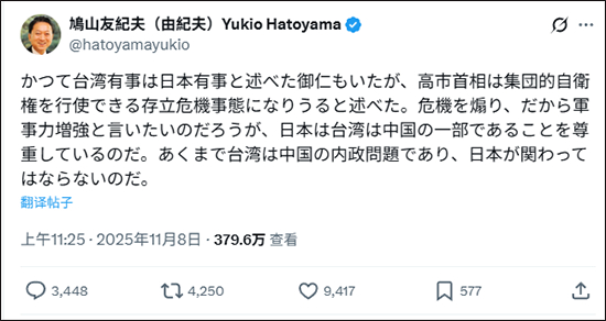 高市早苗“狂言”台灣問題,我大使駁斥當地時間11月10日,日本首相高市早苗在國會眾議院預算委員會二次會議上為其此前關於“存立危機事態”可能適用於“台灣有事”的言論進行澄清和“降溫”,強調那只是一個“假設性回答”,並承諾未來將避免此類具體表述。 據時事通訊社報道,高市早苗稱,“這只是針對最壞情況的假設性回答,並不意味着日本政府的一貫立場發生改變。”她又補充稱,今後將避免就具體案例做出類似表述。 ![]() 11月10日,眾議院預算委員會會議 NHK 中國駐日大使吳江浩當天在X平台上嚴正指出,台灣是中國不可分割的一部分,如何解決台灣問題是中國人自己的事。鼓動“台灣有事就是日本有事”,企圖將日本綁上分裂中國的戰車,最終將走上不歸歧路。 ![]() X平台 據此前共同社報道,當地時間11月7日,日本首相高市早苗在其就任首相後首次眾議院預算委員會會議上,就談及台灣問題時竟聲稱,若台海爆發武力衝突,“有可能被視為‘存亡危機事態’”。 當時,立憲民主黨議員岡田克也質詢時問道:“在何種情況下,‘台灣有事’會對日本構成生存威脅?”首相高市早苗回應稱:“我們將綜合考慮所有信息,並根據每起事件的具體情況做出判斷。我認為,如果中國動用武力,這將屬於日本的‘存亡危機事態’。” 所謂“存亡危機事態”,按照日本在2015年新修訂的安保法內容,是指與日本關係密切的“他國”在遭受武力攻擊,且該攻擊若任其發展將對日本生存構成明顯威脅時,日本可行使集體自衛權。 這意味着,一旦被日本政府認定為“存亡危機事態”,日本自衛隊可在無需事先徵得美方同意的情況下,單方面採取武力行動。並且,高市此番言論還將台灣劃到了“他國”的範圍內,可謂“一石激起千層浪”。 當地時間10月7日,日本前首相野田佳彥在接受採訪時表示,他對高市的表態“感到極為震驚,認為她單方面冒進,存在重大風險”,並稱將在10日的國會審議中對此追責。 野田指出,高市的言論分量極重,“必須格外謹慎”。他認為“歷任首相在類似問題上通常都會有所克制,因為言辭輕率可能對國內外產生重大影響。” 據共同社此前報道,“台灣有事就是日本有事”,即便是前首相安倍晉三,也是在其卸任後才敢發表類似言論,日本歷屆首相在此問題上均沒有過如此明確的發言。而高市早苗卻以現任首相身份公開提出,顯示其極右翼對華立場極其強硬。 此外,前日本首相鳩山由紀夫也於11月8日在X平台上批評稱,“有人曾說‘台灣有事即日本有事’,如今高市首相又稱台灣有事可能成為可行使集體自衛權的‘存亡危機事態’。這顯然是在煽動危機,為強化軍備尋找辯護理由。日本應尊重台灣屬於中國的事實,台灣問題完全屬於中國內政,日本不應干涉。” ![]() X平台 |