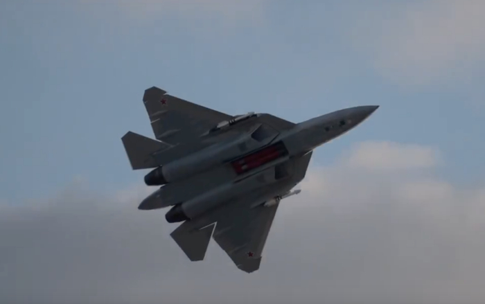 画面首次公开!外媒:苏-57战机打开前部内置弹舱飞行,内载两枚反辐射导弹。