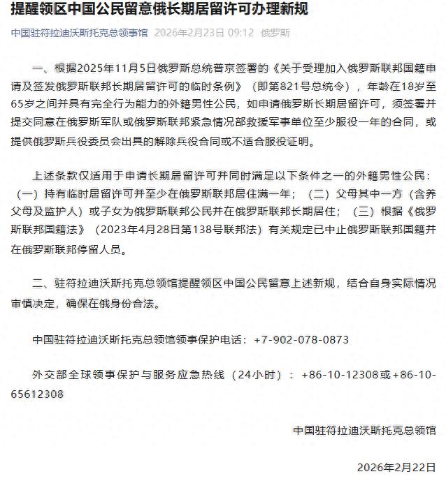 据中国驻符拉迪沃斯托克总领事馆微信公众号2月23日消息,中国驻符拉迪沃斯托克总领馆提醒领区中国公民留意俄长期居留许可办理新规。 一、根据2025年11月5日俄罗斯总统普京签署的《关于受理加入俄罗斯联邦国籍申请及签发俄罗斯联邦长期居留许可的临时条例》(即第821号总统令),年龄在18岁至65岁之间并具有完全行为能力的外籍男性公民,如申请俄罗斯长期居留许可,须签署并提交同意在俄罗斯军队或俄罗斯联邦紧急情况部救援军事单位至少服役一年的合同,或提供俄罗斯兵役委员会出具的解除兵役合同或不适合服役证明。 上述条款仅适用于申请长期居留许可并同时满足以下条件之一的外籍男性公民:(一)持有临时居留许可并至少在俄罗斯联邦居住满一年;(二)父母其中一方(含养父母及监护人)或子女为俄罗斯联邦公民并在俄罗斯联邦长期居住;(三)根据《俄罗斯联邦国籍法》(2023年4月28日第138号联邦法)有关规定已中止俄罗斯联邦国籍并在俄罗斯联邦停留人员。 二、驻符拉迪沃斯托克总领馆提醒领区中国公民留意上述新规,结合自身实际情况审慎决定,确保在俄身份合法。 中国驻符拉迪沃斯托克总领馆领事保护电话:+7-902-078-0873 外交部全球领事保护与服务应急热线(24小时):+86-10-12308或+86-10-65612308