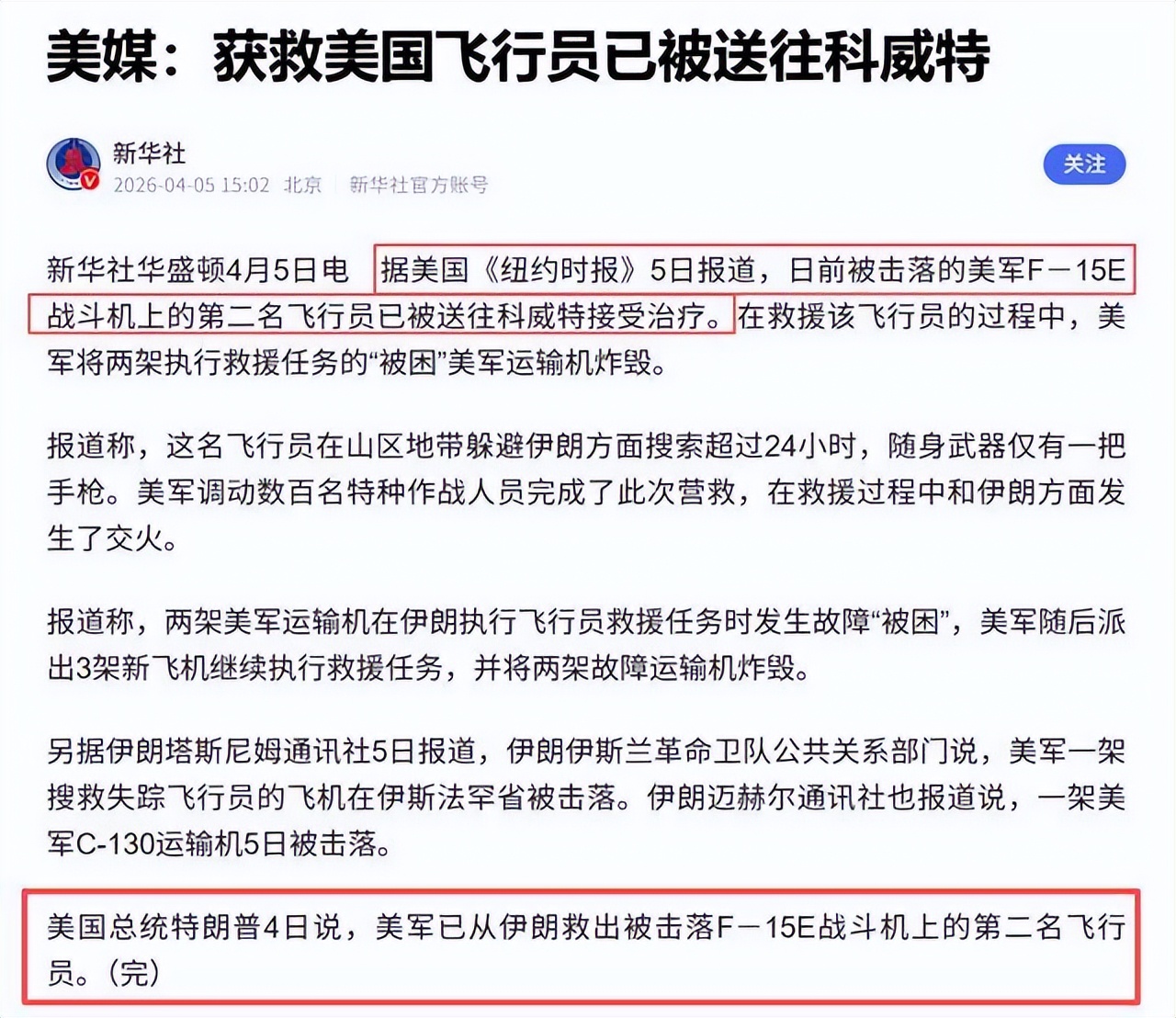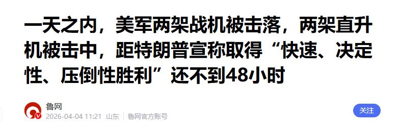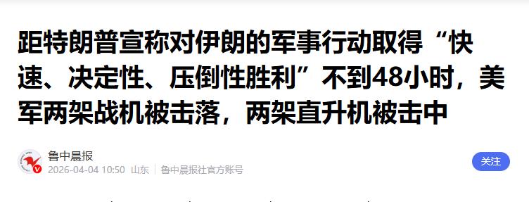 距特朗普宣称对伊朗的军事行动取得“快速、决定性、压倒性胜利”不到48小时,美军两架战机被击落,两架直升机被击中 鲁中晨报 2026-04-04 10:50 山东 鲁中晨报社官方账号