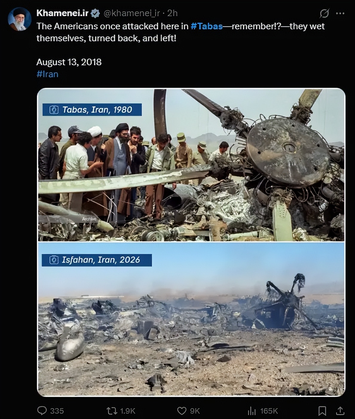 2026年4月5日,已故伊朗前最高领袖阿里·哈梅内伊的X平台英文账号更新动态,配图是1980年美军塔巴斯惨败的旧照,与当下美军战机残骸的对比,引用的是2018年的一段旧语录。