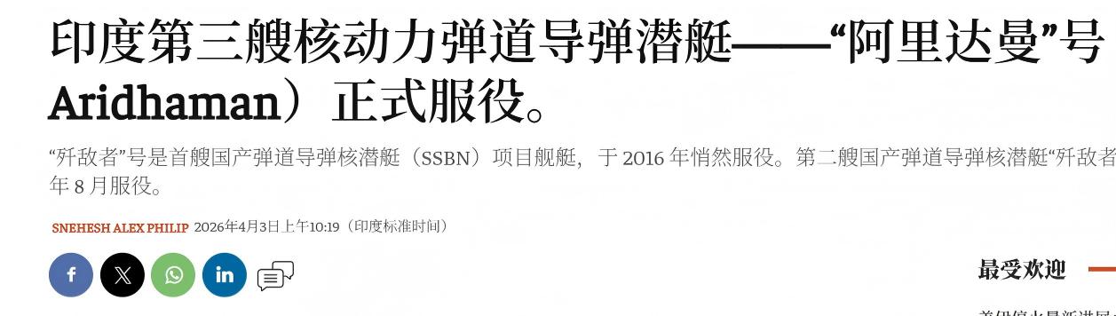 | 第三艘服役了!印度“克敌者”号战略核潜艇入列,加速追赶中美俄 |