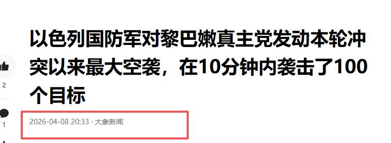 大象新闻2026-04-08《以色列国防军对黎巴嫩真主党发动本轮冲突以来最大空袭,在10分钟内袭击了100个目标》