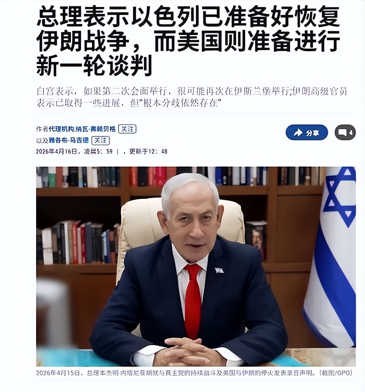 第三个动向来自特拉维夫。以色列总理内塔尼亚胡近期对外释放的信息,跟华盛顿几乎是同一个调子、同一个节拍。据环球网援引以色列媒体报道,内塔尼亚胡公开表示以方已经做好了随时恢复对伊军事行动的准备。他还特意加了一句——"判断战争结局为时过早"。这句话信息量非常大。它意味着在以色列的战略判断中,眼下的停火不是和平,只是战争的中场,下半场随时可能开打。